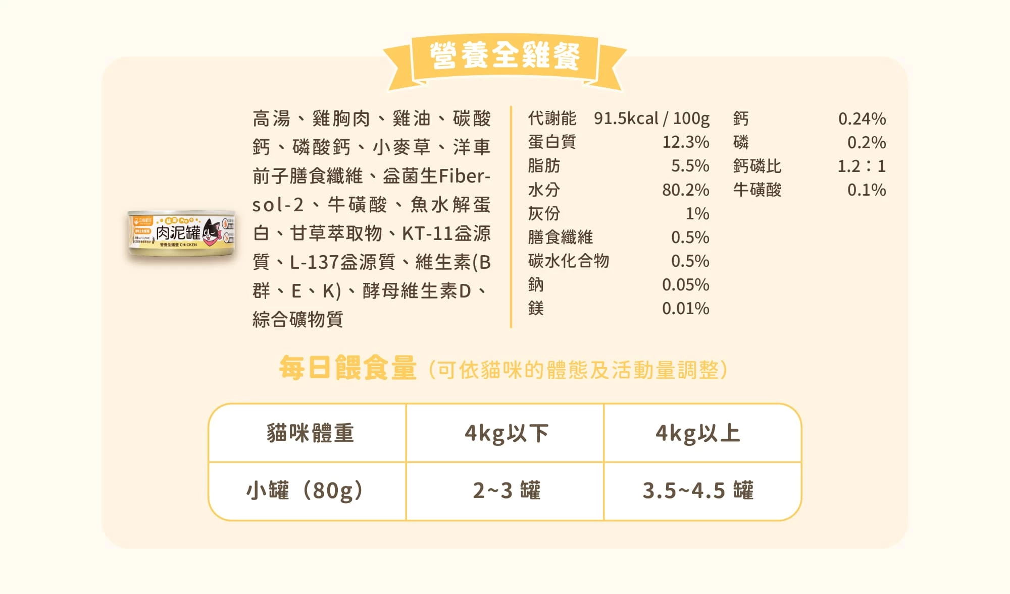 首頁 主食罐 會員價 DOGCATSTAR汪喵星球 益菌PRO+ 綿密肉泥主食罐NT$45 – NT$980價格範圍:NT$45 到 NT$980 像肉泥般好舔好吃的營養主食罐 讓貓咪喜歡到~忍不住一口接一口!! • 超水感綿密口感,符合貓咪舔食習性打造 • 專利益菌三合一,顧腸道助吸收 • 全營養濕主食,98% 高肉含量、低碳水化合物 容量 請選取一個選項80克165克 口味 請選取一個選項營養全雞低敏鴨胸鮮甜虱目魚綜合 數量 請選取一個選項1罐1箱清除 DOGCATSTAR汪喵星球 益菌PRO+ 綿密肉泥主食罐 數量 加入購物車 貨號: D0042 分類: 主食罐, 貓咪專用 品牌: DOGCATSTAR 汪喵星球 描述 額外資訊 評價 (0) 容量 80克, 165克 口味 營養全雞, 低敏鴨胸, 鮮甜虱目魚, 綜合 數量 1罐, 1箱 商品評價 目前沒有評價。 搶先評價 “DOGCATSTAR汪喵星球 益菌PRO+ 綿密肉泥主食罐”取消回覆發佈留言必須填寫的電子郵件地址不會公開。 必填欄位標示為 *名稱 *電子郵件 *您的評價 * 在瀏覽器中儲存顯示名稱、電子郵件地址及個人網站網址,以供下次發佈留言時使用。 送出 Δ 相關商品 會員價 MORESON木入森 貓咪保腎利 NT$615 – NT$1,090價格範圍:NT$615 到 NT$1,090 保養品, 貓咪專用選擇規格 此產品有多種款式。 可在產品頁面選擇選項 會員價 MORESON木入森 貓咪好規泌 NT$445 – NT$785價格範圍:NT$445 到 NT$785 保養品, 貓咪專用選擇規格 此產品有多種款式。 可在產品頁面選擇選項 會員價 MORESON木入森 貓咪膚立好 NT$615 – NT$1,090價格範圍:NT$615 到 NT$1,090 保養品, 貓咪專用選擇規格 此產品有多種款式。 可在產品頁面選擇選項 會員價 DOGCATSTAR汪喵星球 98%FANTASTIC貓用無膠肉蓉主食罐 NT$45 – NT$1,065價格範圍:NT$45 到 NT$1,065 主食罐, 貓咪專用選擇規格 此產品有多種款式。 可在產品頁面選擇選項